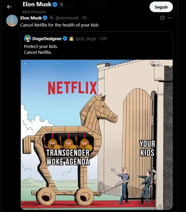 “Cancelen Netflix por la salud de sus hijos”, lanzó el magnate al compartir la publicación de otro usuario en la que se hablaba de una supuesta “agenda woke transgénero”. La declaración del empresario encendió un debate inmediato: mientras algunos rechazaron su postura, otros decidieron seguir su consejo y dar de baja la plataforma.
