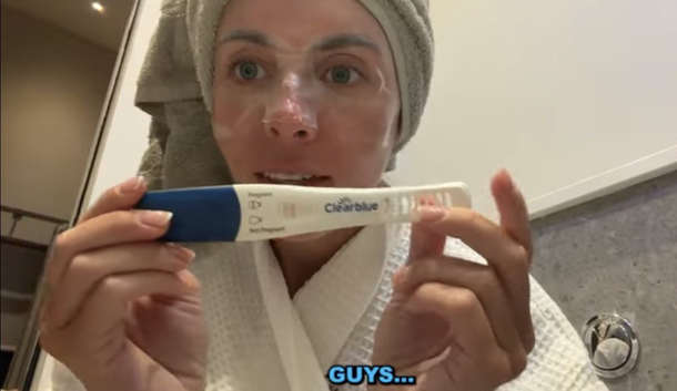 Reconoció que atravesó el momento con ansiedad y expectativa, ya que, según confesó, estaba “un poco nerviosa”. Minutos más tarde regresó frente a la cámara para mostrar el test. “Eso es bastante… es como mitad rosa, mitad blanco. De hecho, parece un muslo de pollo. Sí, definitivamente embarazada. Completamente embarazada”, expresó al observar el resultado.