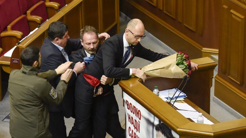 Yatseniuk estaba a la mitad de su discurso sobre la gestión de su gobierno durante 2015 cuando de repente el legislador Oleg Barna, miembro del partido del presidente ucraniano, Petró Poroshenko, se acercó al estrado, le entregó un ramo de rosas con un crespón y lo alzó de la entrepierna.