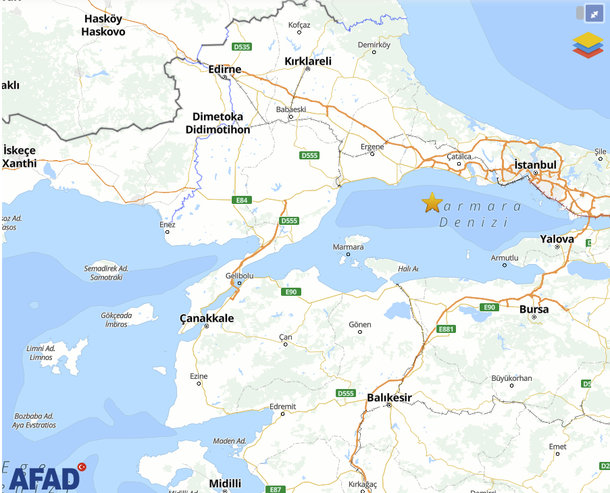 El temblor tuvo lugar a las 12.49 hora local (9:49 gmt) con el epicentro a una profundidad de 6,9 kilómetros en la falla geológica que atraviesa el mar de Mármara, según informó la Agencia Nacional de Gestión de Desastres (AFAD) y el ministro del Interior, Ali Yerlikaya.