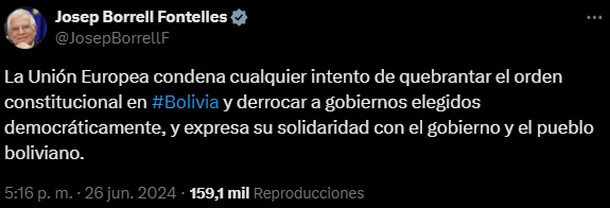Entre los variados mensajes, la Unión Europea se pronunció en la voz de Josep Borrell Fontelles, alto representante de ese organismo para Asuntos Exteriores y Política de Seguridad, quien en su cuenta de X aseguró: "La Unión Europea condena cualquier intento de quebrantar el orden constitucional en #Bolivia y derrocar a gobiernos elegidos democráticamente, y expresa su solidaridad con el gobierno y el pueblo boliviano".