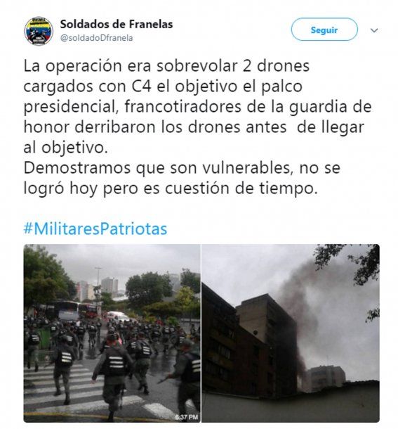 "La operación era sobrevolar 2 drones cargados con C4 el objetivo el palco presidencial, francotiradores de la guardia de honor derribaron los drones antes de llegar al objetivo. Demostramos que son vulnerables, no se logró hoy pero es cuestión de tiempo", explicó la agrupación.