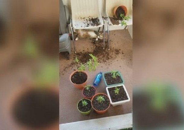 Las imágenes muestran las macetas tiradas por el suelo y las plantas de marihuana dañadas. Las verdaderas estrellas del video, sin embargo, son los dos gatos, que apenas pueden moverse por lo que consumieron.