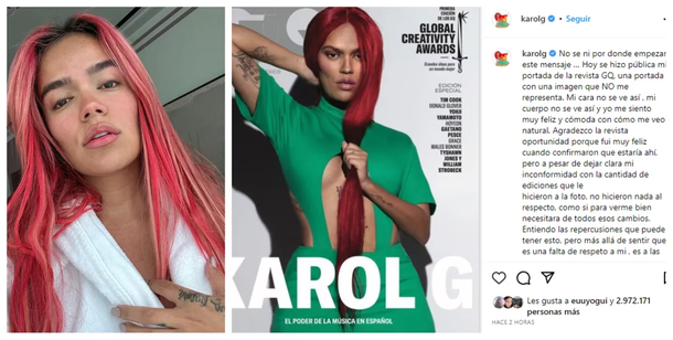 La cantante colombiana Karol G expresó su enojo con una revista estadounidense que editó en exceso su imagen para que luciera más delgada y dijo que es una "falta de respeto" tanto hacia ella como a todas las mujeres que buscan sentirse "cómodas" con su cuerpo.