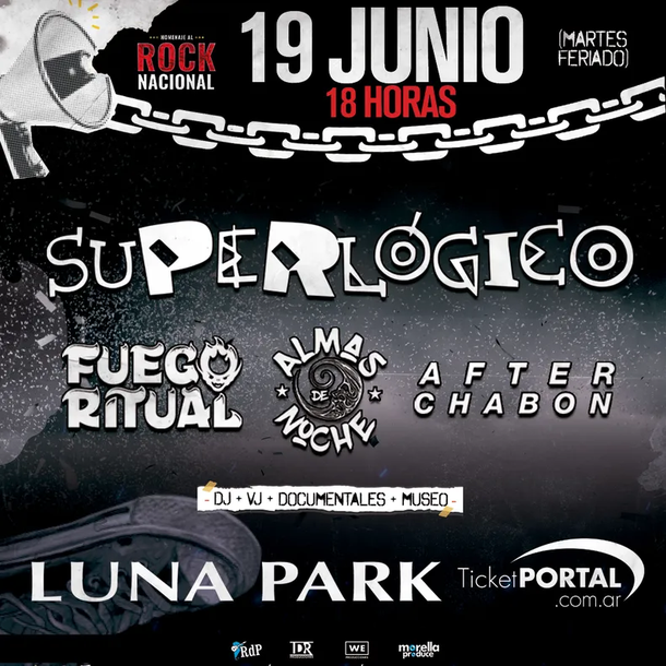 "Homenaje al rock nacional" es el nombre del espectáculo que reúne a Superlógico, agrupación que recrea la música de Los Redondos; After Chabón, tributo a Sumo; Fuego Ritual, dedicada a la obra de Los Piojos; y Almas de Noche, a la de Callejeros.