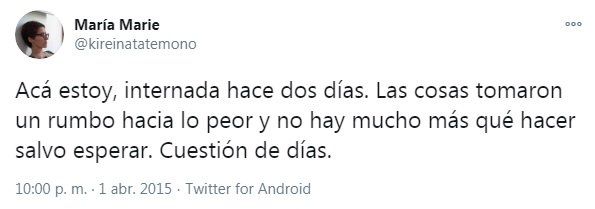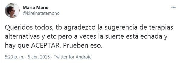 Durante los meses internada, María Marie habló del cáncer sin tapujos, criticando incluso la frase “larga y dolorosa enfermedad” que muchas veces suele usarse en los medios para evitar decir una palabra que tanto temor lleva acarreada. Con ironía y humor negro, lo expuso con todas las letras y contó en Twitter cada una de las vivencias: los vómitos, el insomnio, los efectos de la quimioterapia. Todo de lo que no se habla. María Marie tuiteaba que se estaba muriendo.