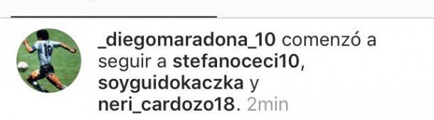 Cardozo es hasta el momento el único futbolista argentino que sigue Maradona. Hasta este martes, la única cuenta relacionada con el fútbol que estaba entre sus seguidos era la del español Ander Herrera, mediocampista del Manchester United.