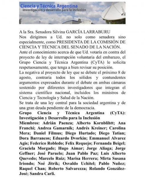 El Grupo Ciencia y Técnica Argentina (CyTA) dio a conocer una carta dirigida Silvina García Larraburu - quien preside la Comisión de Ciencia y Técnica del Senado- en la que le piden que revea su voto en contra del proyecto de ley para legalizar el aborto.