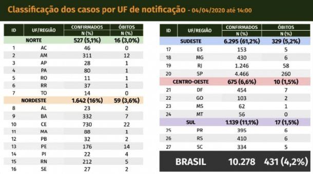 La cifra total de casos de coronavirus asciende a 10.278, de los cuales 431 fallecieron. San Pablo es el estado más afectado.