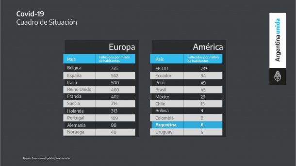 "Por cada millón de personas, Argentina tiene 6 fallecidos", anunció el Presidente. "Les muestro esto para que se den cuenta que tiene sentido el esfuerzo que estamos haciendo", expresó.
