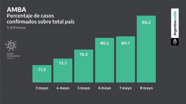 En la primera filmina, Fernández mostró que hay 5.600 casos acumulados hasta este viernes, 8 de mayo, aunque "debemos lamentar 8 nuevos fallecimientos".