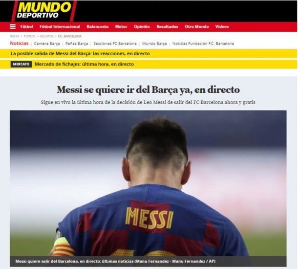 El medio catalán el Mundo Deportivo, que sigue el paso a paso la actualidad del equipo catalán, apenas se conoció la impactante noticia tituló: "Messi se quiere ir del Barça ya”.