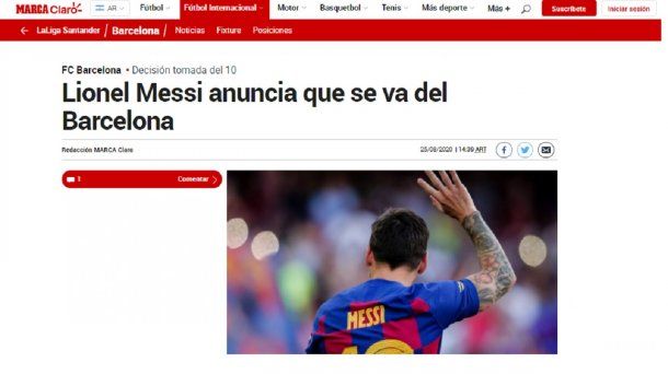 La noticia ocupa el lugar central en todos los medios de España. Marca abre su web comunicando la decisión del Lio y habla sobre las razonas que lo llevaron a tomarla y, también, el apoyo que recibió del ex capitán del equipo catalán, Carles Puyol, quien publicó un mensaje para Messi en Twitter.