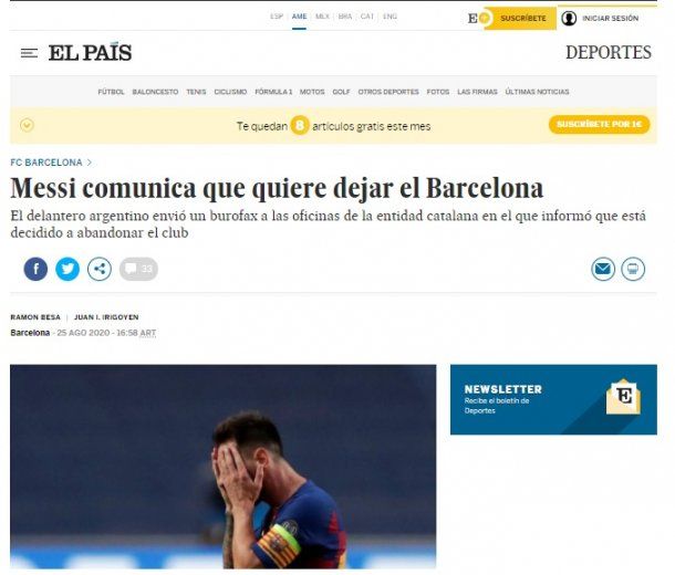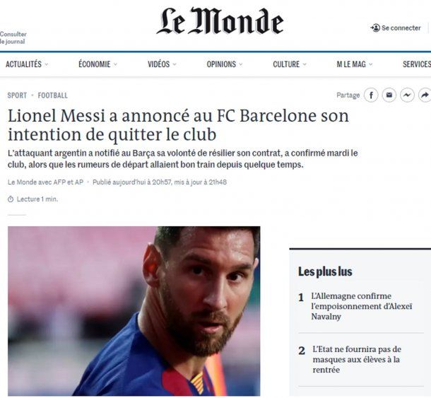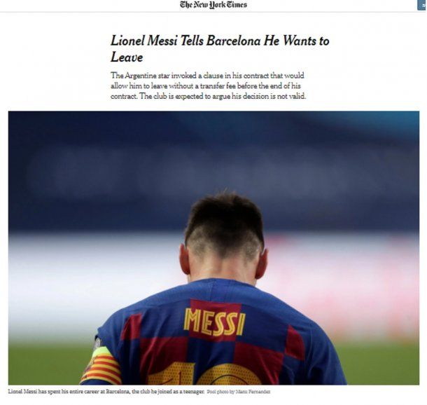 El diario El País pone en portada “Messi comunica que quiere dejar el Barcelona”; mientras que el medio italiano La Gazzetta dello Sport destaca: "Messi le comunicó a Barcelona que quiere irse de inmediato".