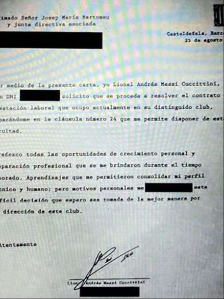 "Por medio de la presente carta, yo Lionel Andrés Messi Cuccittini, solicita que se proceda a resolver el contrato de prestación laboral que ocupo actualmente en su distinguido club, amparándose en la cláusula número 24 que me permite disponer de esta facultad", afirmó el escrito, que trascendió en redes sociales.