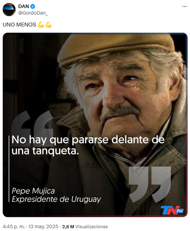 Gordo Dan compartió en su cuenta de X un mensaje que dice "Uno menos", junto a emojis, acompañado de una imagen de Mujica y una cita del expresidente: "No hay que pararse delante de una tanqueta".