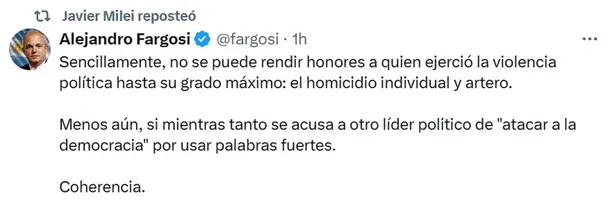 En Casa Rosada decidieron mantener silencio y solo Cancillería emitió un escueto comunicado. En tanto, el presidente Javier Milei no se expresó directamente sobre el tema y lo único que hizo fue republicar un violento tuit del abogado Alejandro Fargosi: "Sencillamente, no se puede rendir honores a quien ejerció la violencia política hasta su grado máximo: el homicidio individual y artero", se puede leer.