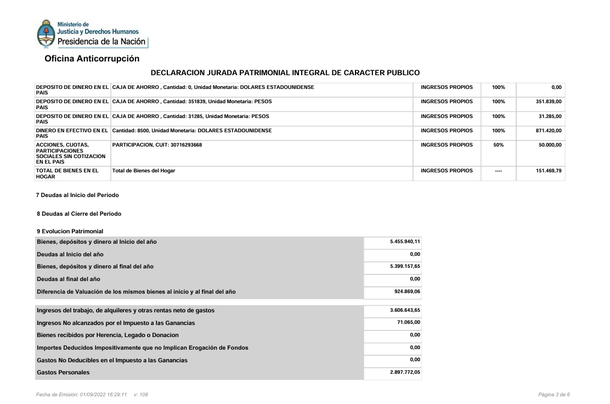 La última declaración jurada de su situación patrimonial durante el periodo anual 2021 - con fecha de publicación en septiembre de 2022 - . Allí aseguró dijo tener un total de bienes, depósitos y dinero por $5.399.157 al final del año y no poseer deudas.