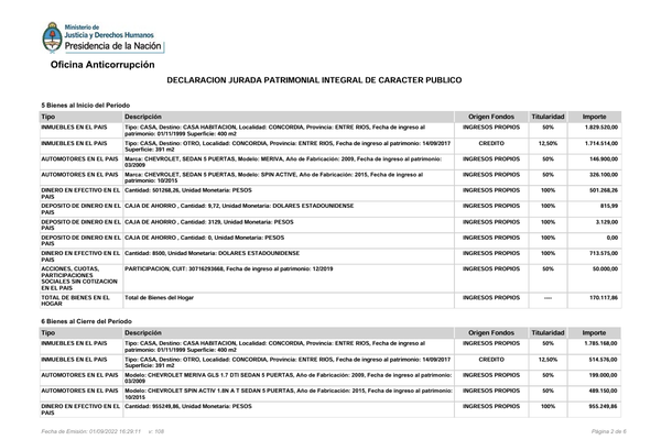 - Casa en Concordia, Entre Ríos, adquirida en 2017, con un total de 391 m2. Es el titular del 12,50% y la declaró a $514.576.