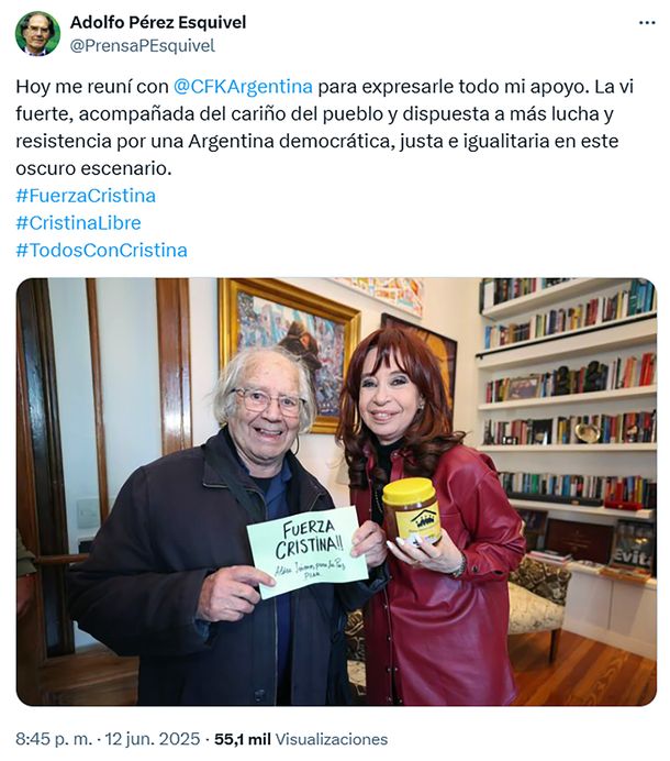 “Hoy me reuní con Cristina Fernández de Kirchner para expresarle todo mi apoyo. La vi fuerte, acompañada del cariño del pueblo y dispuesta a más lucha y resistencia por una Argentina democrática, justa e igualitaria en este oscuro escenario”, expresó el referente de los derechos humanos en redes sociales.