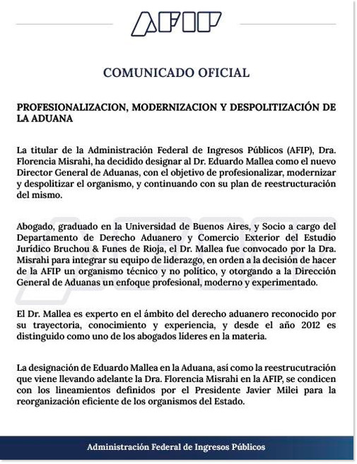 La titular de la Administración Federal de Ingresos Públicos (AFIP), Florencia Misrahi, designó a Eduardo Mallea como el nuevo Director General de Aduanas. El funcionario, especialista en Derecho Aduanero y Comercio Exterior, asumirá el cargo en reemplazo de Rosario Lodovico.