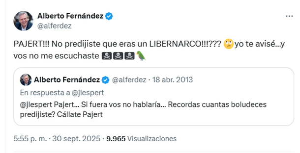 Fernández desempolvó un viejo apodo que le había dedicado al economista en 2013, y lo actualizó con una grave acusación. En su cuenta de X, el expresidente citó un tuit de hace más de una década y escribió: "¡PAJERT!!! ¿No predijiste que eras un LIBERNARCO!!!??? yo te avisé… y vos no me escuchaste".