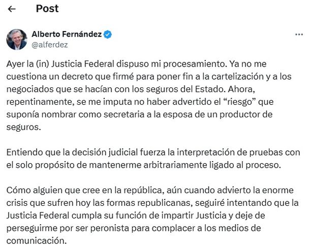 "Como alguien que cree en la república, aún cuando advierto la enorme crisis que sufren hoy las formas republicanas, seguiré intentando que la Justicia Federal cumpla su función de impartir Justicia y deje de perseguirme por ser peronista para complacer a los medios de comunicación", concluyó Alberto Fernández en la red social X y adjuntó el comunicado de prensa de su abogada.