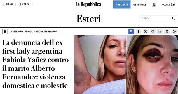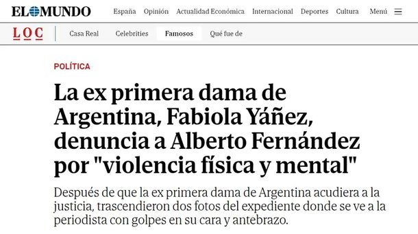 El primer medio de España en hacer eco de la denuncia fue El Mundo, que publicó: "La exprimera dama de Argentina, Fabiola Yañez, denuncia a Alberto Fernández por 'violencia física y mental'", y dio detalles sobre las imágenes de sus lesiones sufridas en rostro y brazo.