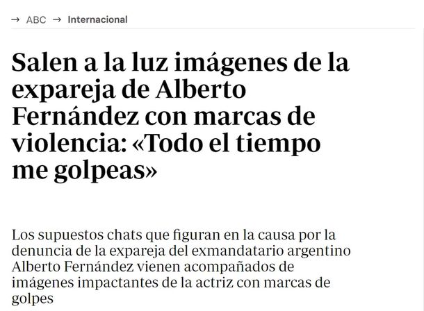 "Salen a la luz imágenes de la expareja de Alberto Fernández con marcas de violencia: 'Todo el tiempo me golpeas'", tituló el diario ABC de España con un duro textual de Fabiola Yáñez que habría sido encontrado en su chat con María Cantero, la exsecretaria de Alberto Fernández, en una pericia por otra investigación judicial.