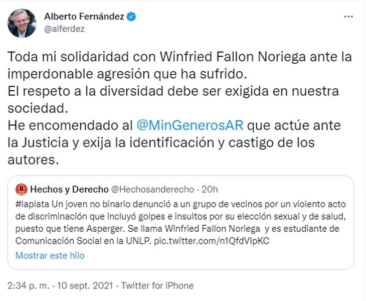 El presidente Alberto Fernández se expresó hoy contra la agresión que recibió Winfried Fallon Noriega, una persona no binaria y con síndrome de Asperger, quien fue víctima de una brutal golpiza en La Plata.