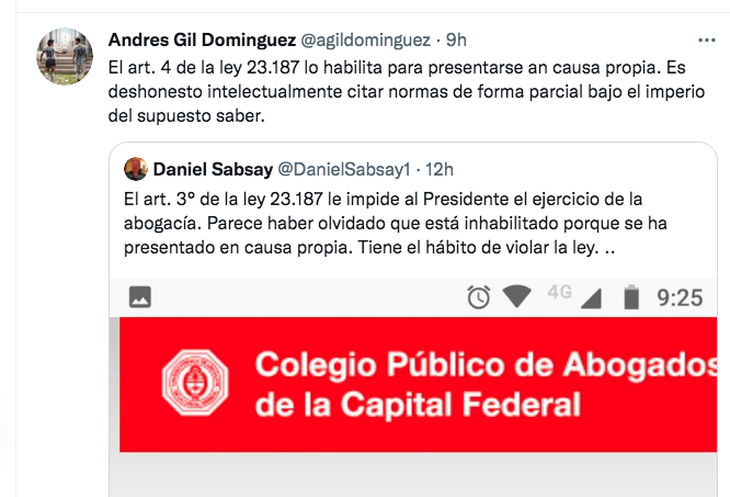 Y Gil Domínguez le respondió: "El art. 4 de la ley 23.187 lo habilita para presentarse an causa propia. Es deshonesto intelectualmente citar normas de forma parcial bajo el imperio del supuesto saber".