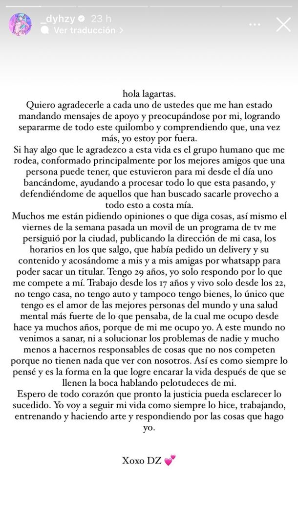 El contundente comunicado de Dyhzy fue subido a las historias de Instagram: "Quiero agradecerle a cada uno de ustedes que me han estado mandando mensajes de apoyo y preocupándose por mí, logrando separarme de este quilombo y comprendiendo, una vez más, que yo estoy por fuera".