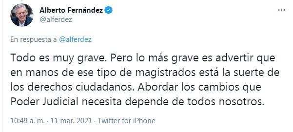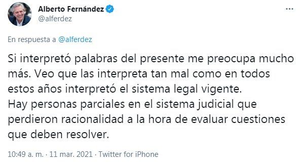 “Si interpretó palabras del presente me preocupa mucho más. Veo que las interpreta tan mal como en todos estos años interpretó el sistema legal vigente. Hay personas parciales en el sistema judicial que perdieron racionalidad a la hora de evaluar cuestiones que deben resolver”, agregó el Presidente.
