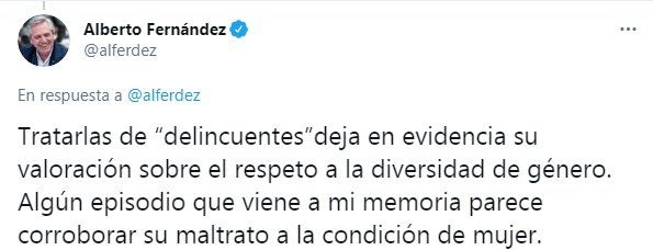 “Tratarlas de ‘delincuentes’ deja en evidencia su valoración sobre el respeto a la diversidad de género. Algún episodio que viene a mi memoria parece corroborar su maltrato a la condición de mujer”, escribió Fernández en su cuenta de Twitter.
