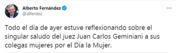 “Feliz día, delincuentes”. Ese fue el mensaje que envió el juez Juan Carlos Gemigniani vía WhatsApp a sus colegas en el Día de la Mujer. Sus palabras generaron un fuerte repudio en el ámbito de la Justicia y del Estado, al punto que el presidente Alberto Fernández se expresó este jueves contra las polémicas palabras del magistrado.