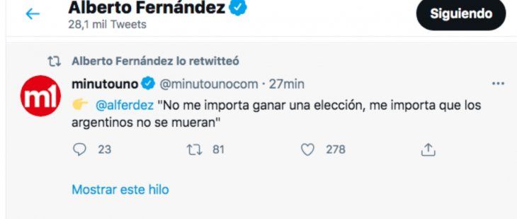 "No me importa ganar una elección, me importa que los argentinos no se mueran", sentenció Alberto Fernández y así reprodujo Minuto Uno desde sus redes sociales Se enojó Alberto
