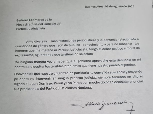 Lo hizo a través de un comunicado en el expresa que tomó la decisión “para no manchar los honores que me merece el Partido Justicialista” ante las “diversas manifestaciones periodísticas y la denuncia relacionada a cuestiones de género que son de público conocimiento”.