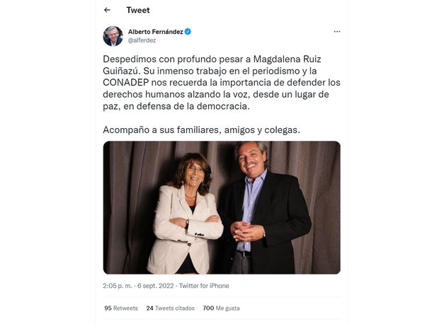"Despedimos con profundo pesar a Magdalena Ruiz Guiñazú. Su inmenso trabajo en el periodismo y la Conadep nos recuerda la importancia de defender los Derechos Humanos alzando la voz, desde un lugar de paz, en defensa de la democracia", señaló el jefe de Estado a través de sus redes sociales.