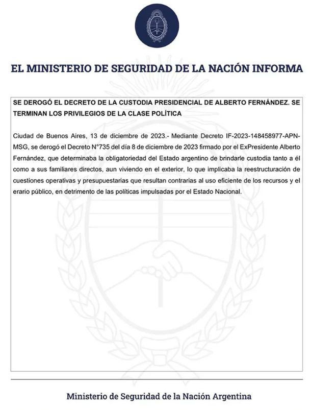“Se derogó el Decreto N°735 del día 8 de diciembre de 2023 firmado por el ExPresidente Alberto Fernández, que determinaba la obligatoriedad del Estado argentino de brindarle custodia tanto a él como a sus familiares directos, aun viviendo en el exterior, lo que implicaba la reestructuración de cuestiones operativas y presupuestarias que resultan contrarias al uso eficiente de los recursos y el erario público, en detrimento de las políticas impulsadas por el Estado Nacional”, señalaba el texto.