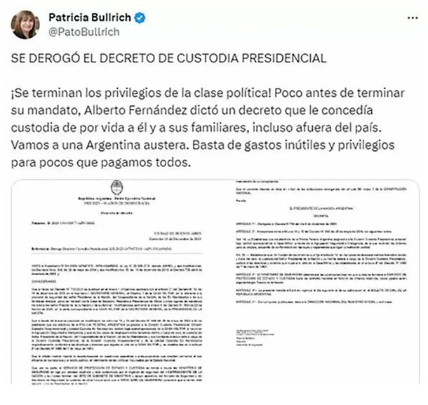 Pese a que el miércoles el Ministerio de Economía emitió un comunicado dónde informaban que se había derogado el decreto que firmó Alberto Fernández que le otorgaba tanto a él como a sus familiares directos custodia oficial fuera del país. Esto fue celebrado por la titular de la cartera, Patricia Bullrich, en sus redes sociales pero al poco tiempo borró el mensaje y el decreto no fue publicado este jueves en el Boletín Oficial.