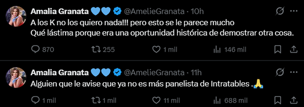 En medio del discurso, Granata publicó: “Alguien que le avise que ya no es más panelista de Intratables”. La frase hizo alusión al pasado mediático de Milei, quien antes de su salto a la política participó en distintos programas de debate televisivo, entre ellos el ciclo Intratables. El mensaje rápidamente se viralizó y generó una ola de respuestas tanto de apoyo como de crítica hacia la diputada.