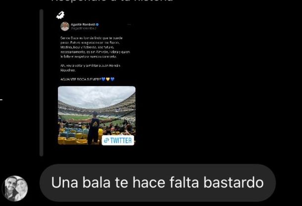 El presidente de la Juventud Radical porteña, Agustín Rombolá, denunció haber recibido una serie de mensajes intimidatorios que recrudecieron en los últimos días y responsabilizó por su seguridad y la de su familia al candidato presidencial de La Libertad Avanza (LLA), Javier Milei, y a su compañera de fórmula, Victoria Villarruel.