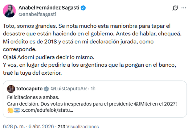 Anabel Fernández Sagasti salió al cruce del ministro Luis Caputo, luego de que este replicara en redes sociales una publicación que la vinculaba con créditos otorgados por el Banco Nación, en medio de la polémica por los préstamos a funcionarios y dirigentes de La Libertad Avanza (LLA).