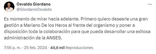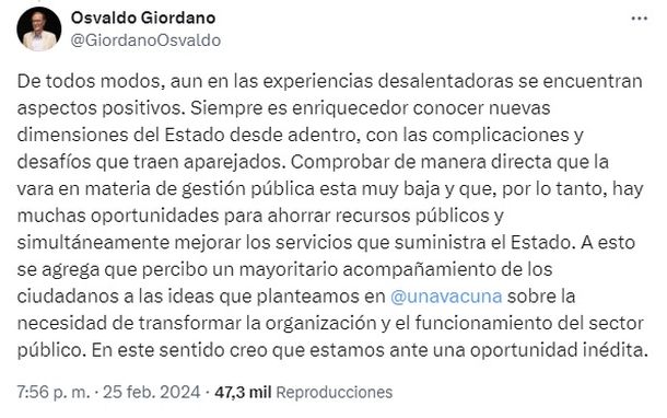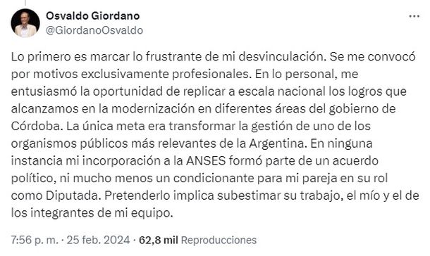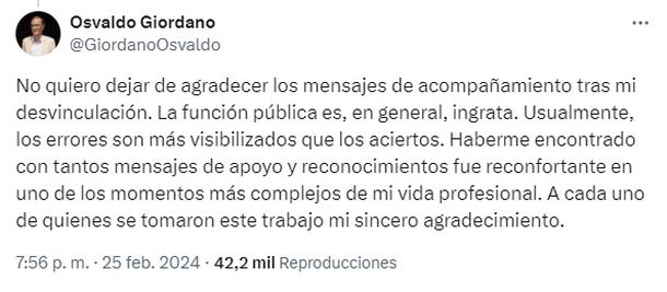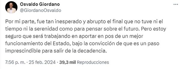 "Fue tan inesperado y abrupto el final que no tuve ni el tiempo ni la serenidad como para pensar sobre el futuro. Pero estoy seguro de que será trabajando en aportar en post de un mejor funcionamiento del Estado, bajo la convicción de que es un paso imprescindible para salir de la decadencia", expresó Giordano en una serie de mensajes publicados anoche en su cuenta personal de la red social X.