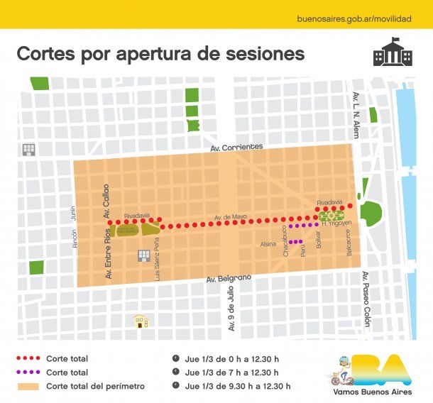 Entre las 9.30 a 12.30 además, se dispondrá el corte total en el perímetro comprendido por las avenidas Corrientes, Leandro N. Alem, Paseo Colón, Belgrano, Rincón/Junín.
