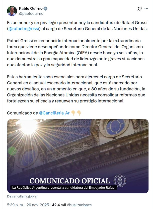 "Es un honor y un privilegio presentar hoy la candidatura de Rafael Grossi al cargo de Secretario General de las Naciones Unidas", expresó Quirno a través de su perfil oficial de X, donde habló de elegido por el Gobierno de Javier Milei para la ONU.
