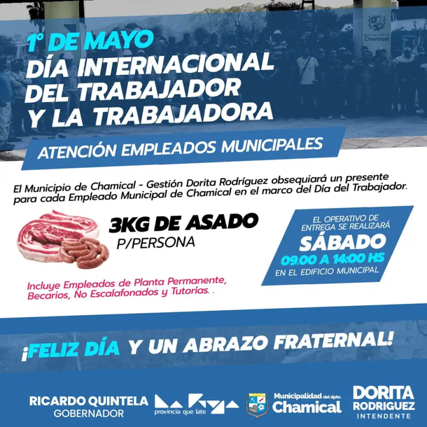 Dora Rodríguez, intendenta de Chamical -ciudad ubicada a 130 kilómetros de la capital de provincia de La Rioja-, anunció que le regalará 3 kilos de asado a todos los empleados del municipio por el Día del Trabajador que se viene este domingo primero de mayo.