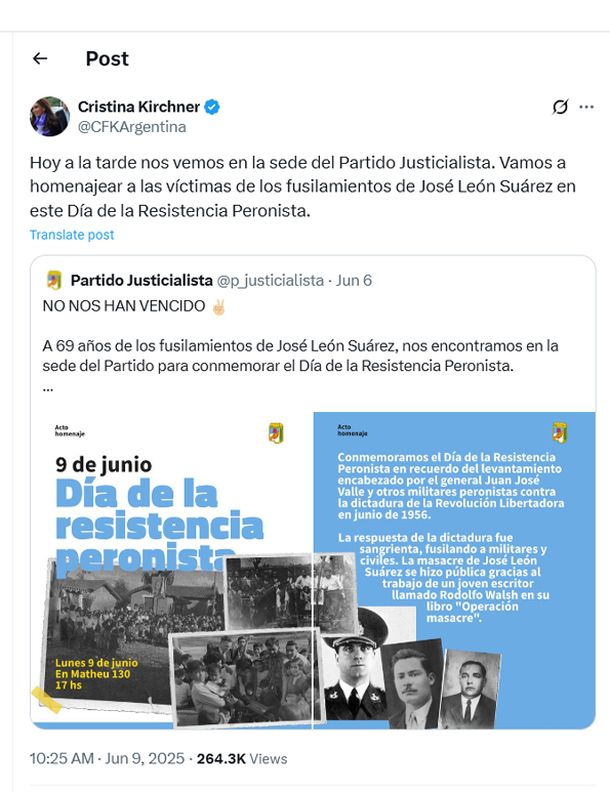En este contexto, y en el marco del Día de la Resistencia peronista, Cristina Kirchner anunció que iba a encabezar un acto en homenaje a las víctimas de los fusilamientos de José León Suárez.