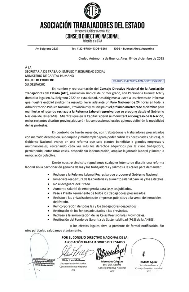 La Asociación Trabajadores del Estado (ATE) anunció un paro nacional de 24 horas para el martes 9 de diciembre, acompañado de una movilización al Congreso de la Nación. La medida fue tomada en rechazo a la reforma laboral impulsada por el gobierno del presidente Javier Milei.