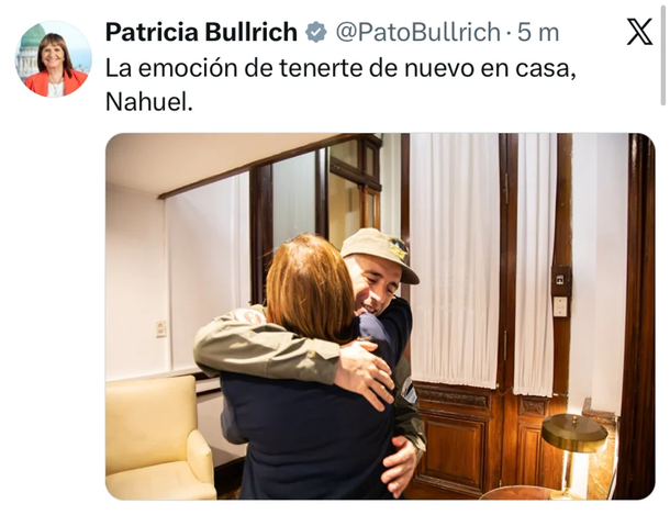 "La emoción de tenerte de nuevo en casa, Nahuel", escribió la legisladora libertaria en su cuenta de X, tras la reunión en su despacho del Senado.